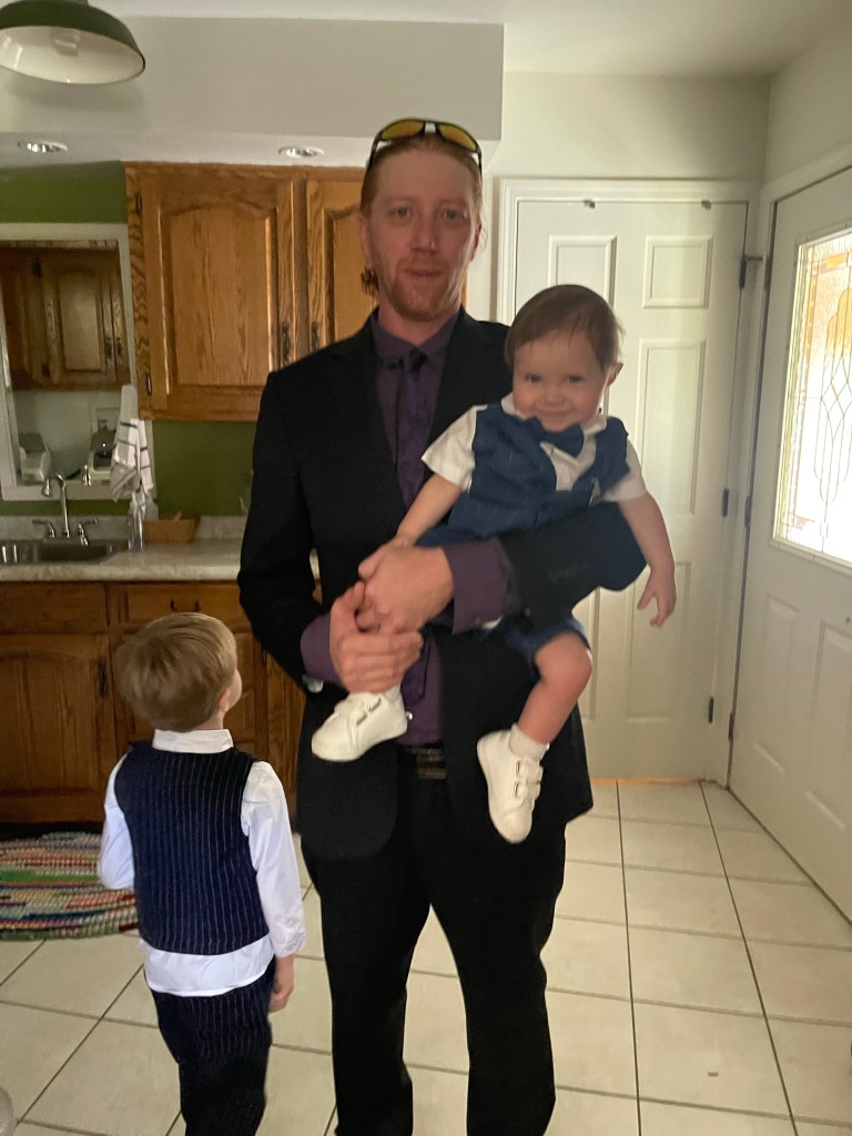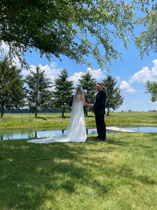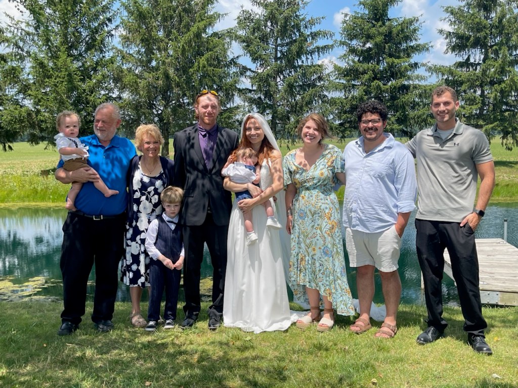 Her daddy walking her down “the aisle.”Her hubby’s nephew was the minister.We have never seen our daughter so happy!! What a glorious day!! She smiled all day!! Her hubby loves her dearly, and she him!!The four-yr-old had an attitude about taking pics that day! Unusual, because he has been anxious for his mommy to share his last name, pus loves to see pics of himself on my phone or watch!!Our family at this time!